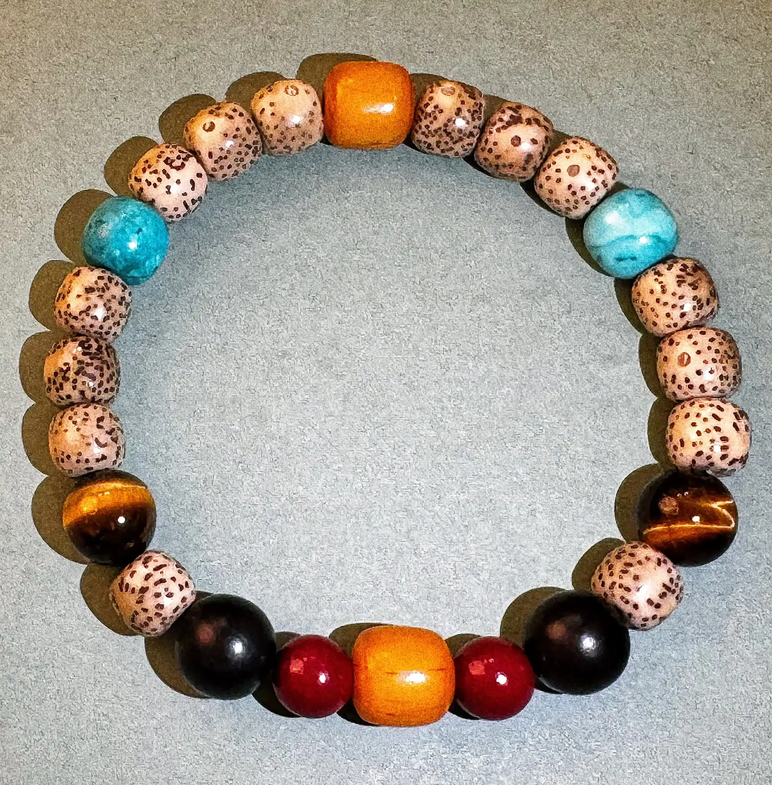 Main materials : Star Moon Bodhi (8.2mm), Black Tiger Eye (9.9mm), Turquoise (9.4mm), Beeswax (10mm), Cinnabar*8.2mm), Ebony (10.3mm)