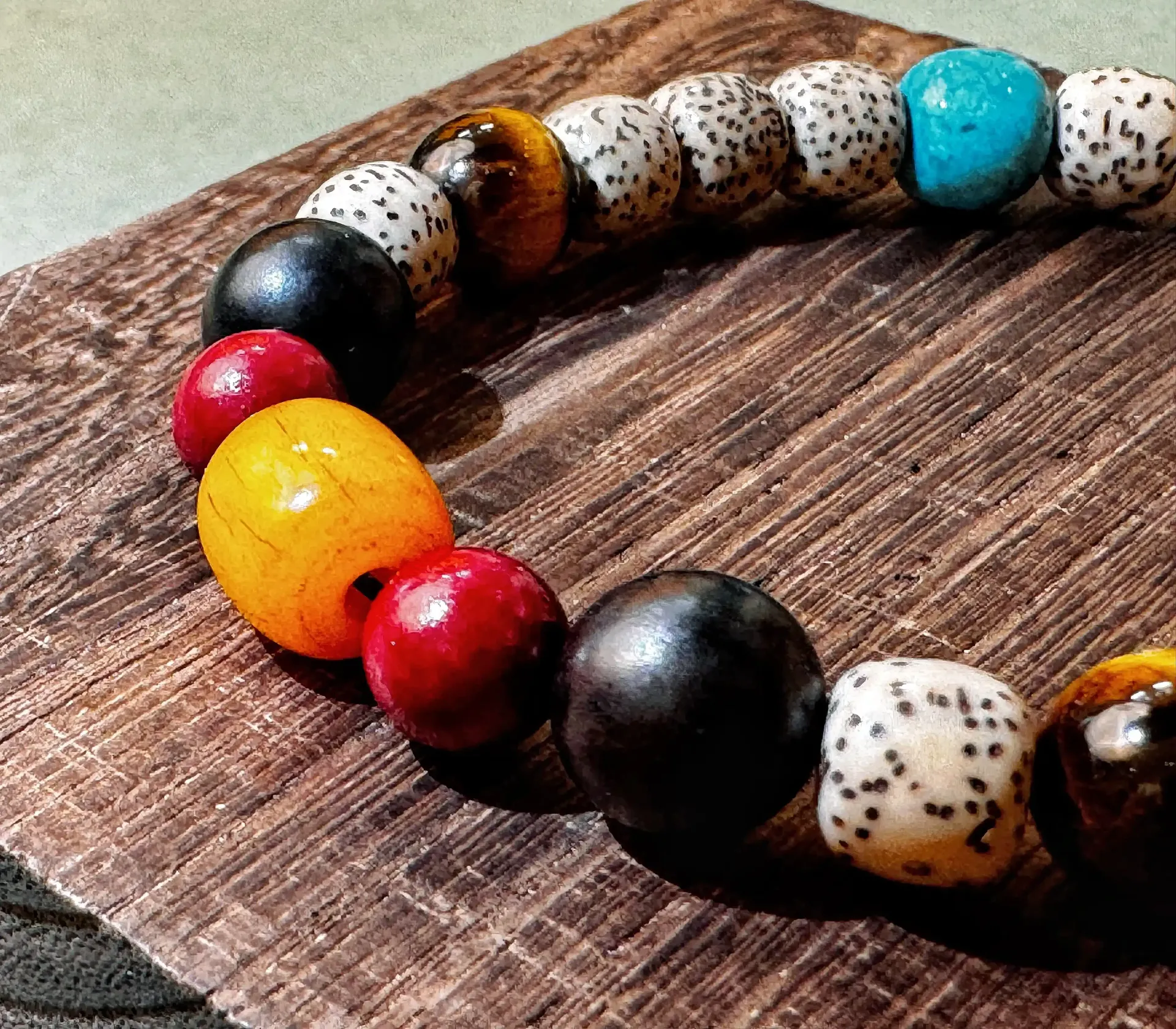The entire string is strung together by a star-moon bodhi bead, each measuring 8.2mm in diameter, symbolizing the continuous flow of the astrological phenomena and the rhythm of the universe. Black tiger's eye (9.9mm, metal element) signifies perseverance and courage, stabilizing the aura; turquoise (9.4mm, water element) soothes the mind and calms the emotions; ebony (10.3mm, wood element) symbolizes vitality and growth, bringing wealth and connections; cinnabar (8.2mm, fire element) ignites passion and vitality, igniting inner drive; and beeswax (10mm, earth element) offers a rich, stable texture, carrying overall energy and promoting the smooth circulation of the five elements. Each material is not only beautifully unique, but its energies interact on the wrist, alluding to the principles of the universe and the balance of nature.