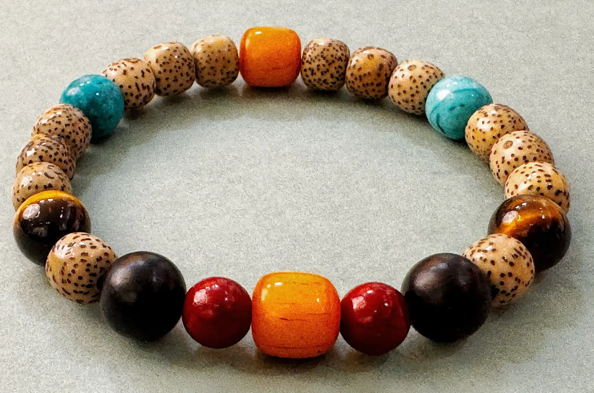 Beads of Star Moon Bodhi, Black Tiger's Eye, Turquoise, Ebony, Cinnabar, and Beeswax intertwine to evoke the interplay of the Five Elements. With Earth as its root, the five elements, metal, wood, water, and fire, are integrated to symbolize a secure foundation, harmonious aura, and career advancement. Wearing this amulet safeguards the energy cycle and natural balance.