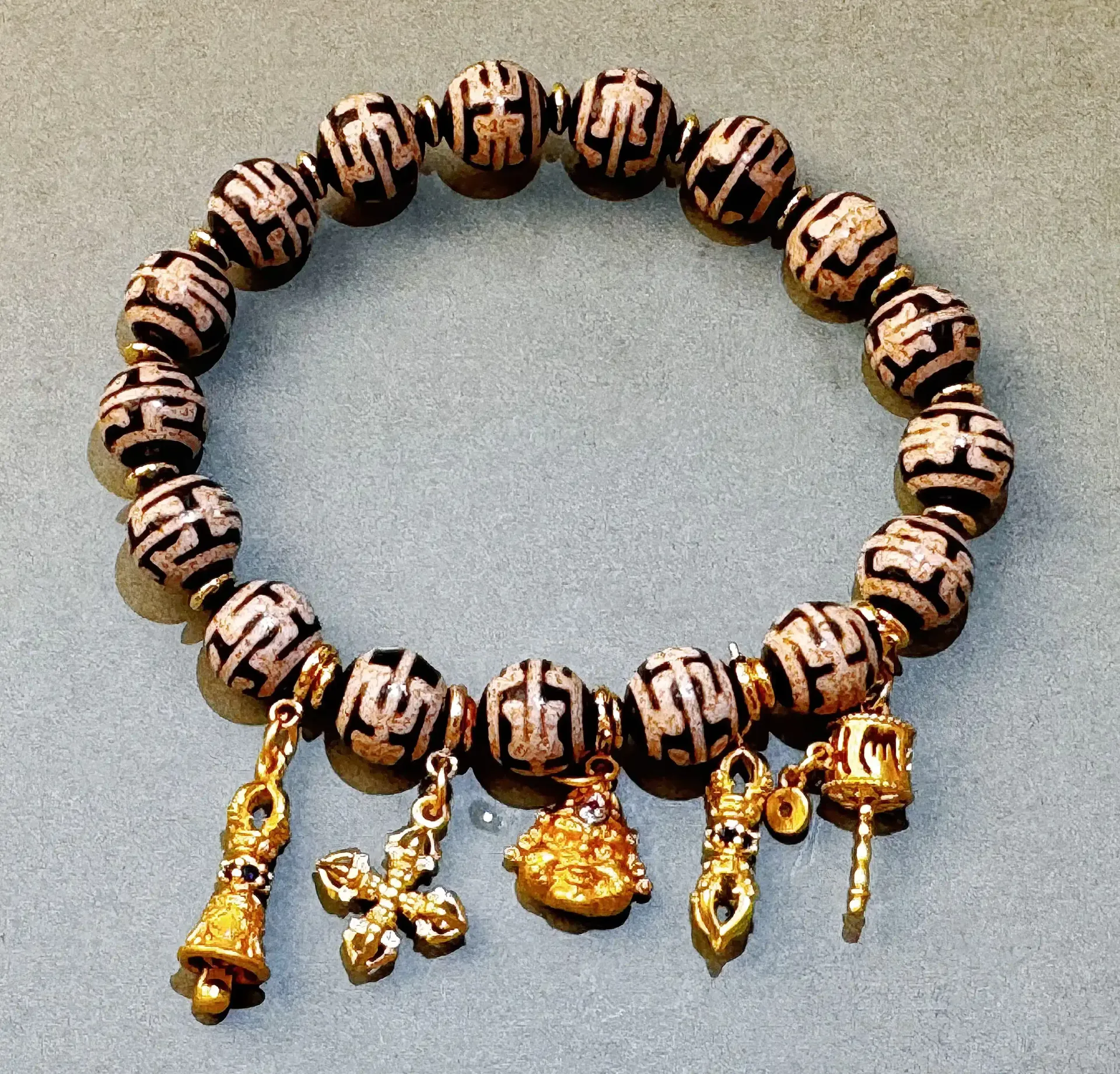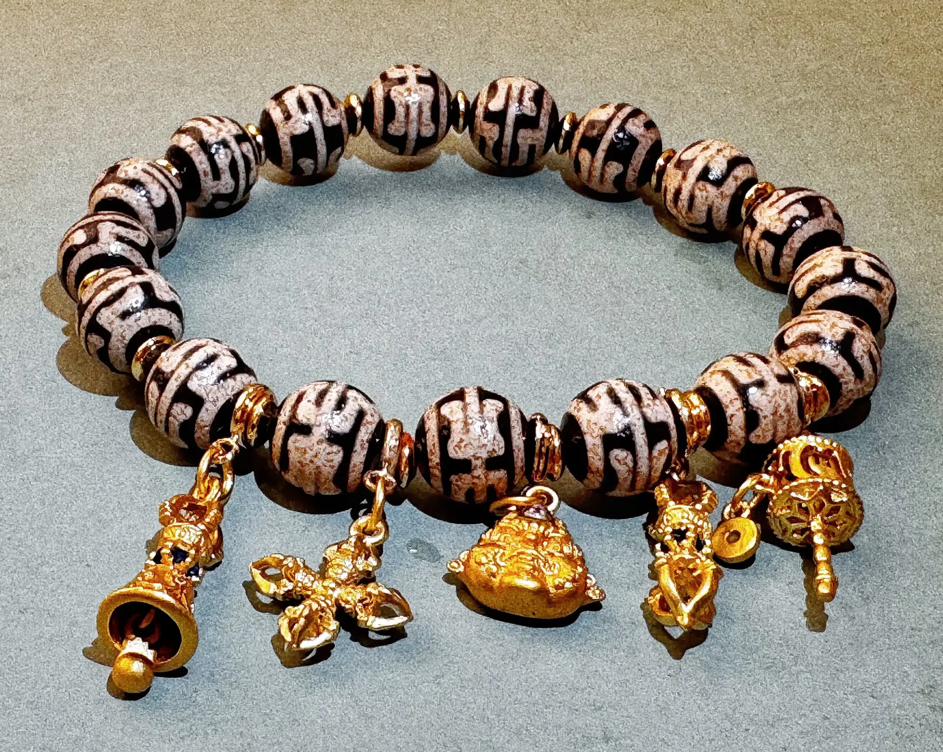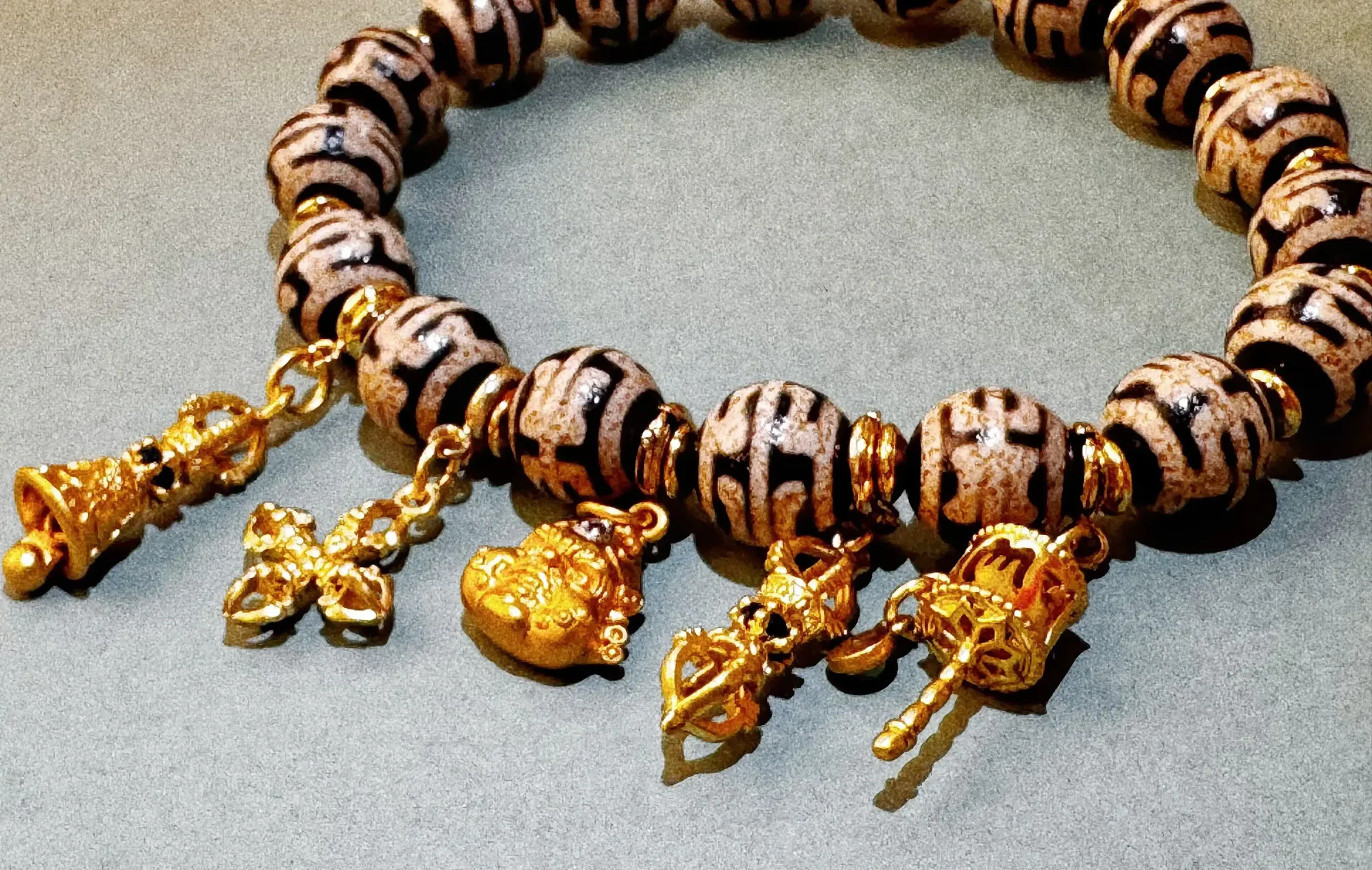 Materiales principales :Cuentas Dzi de ágata calentadas con agua (10,2 mm), vajra, rueda de oración, dios de la riqueza, campana