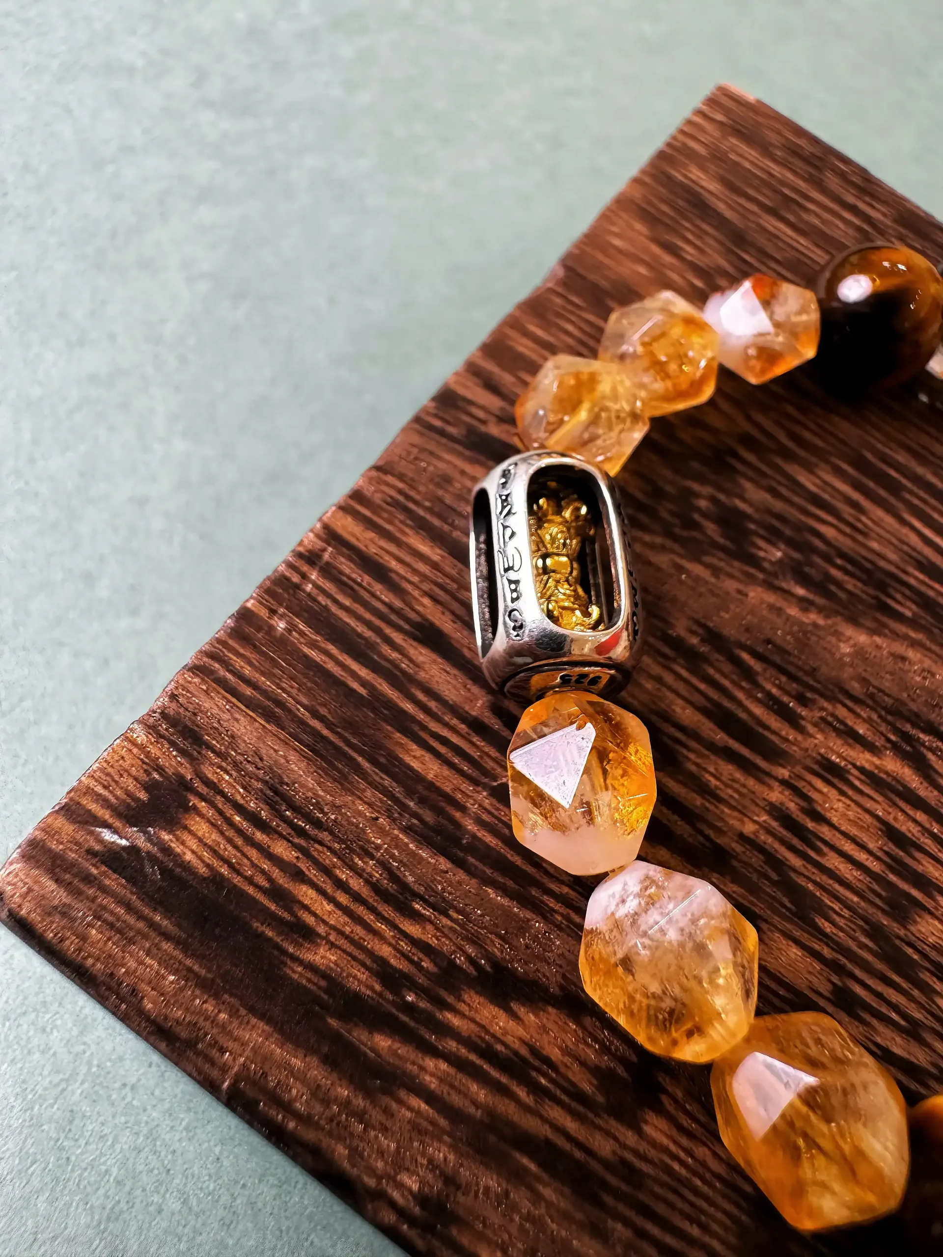 La combinación de ojo de tigre amarillo, citrino, amatista y cristal blanco simboliza las cuatro energías protectoras de los Cuatro Elementos, transmitiendo auspiciosidad y plenitud. Ayuda a equilibrar las emociones, crea una atmósfera armoniosa y facilita una comunicación interpersonal más fluida y natural.