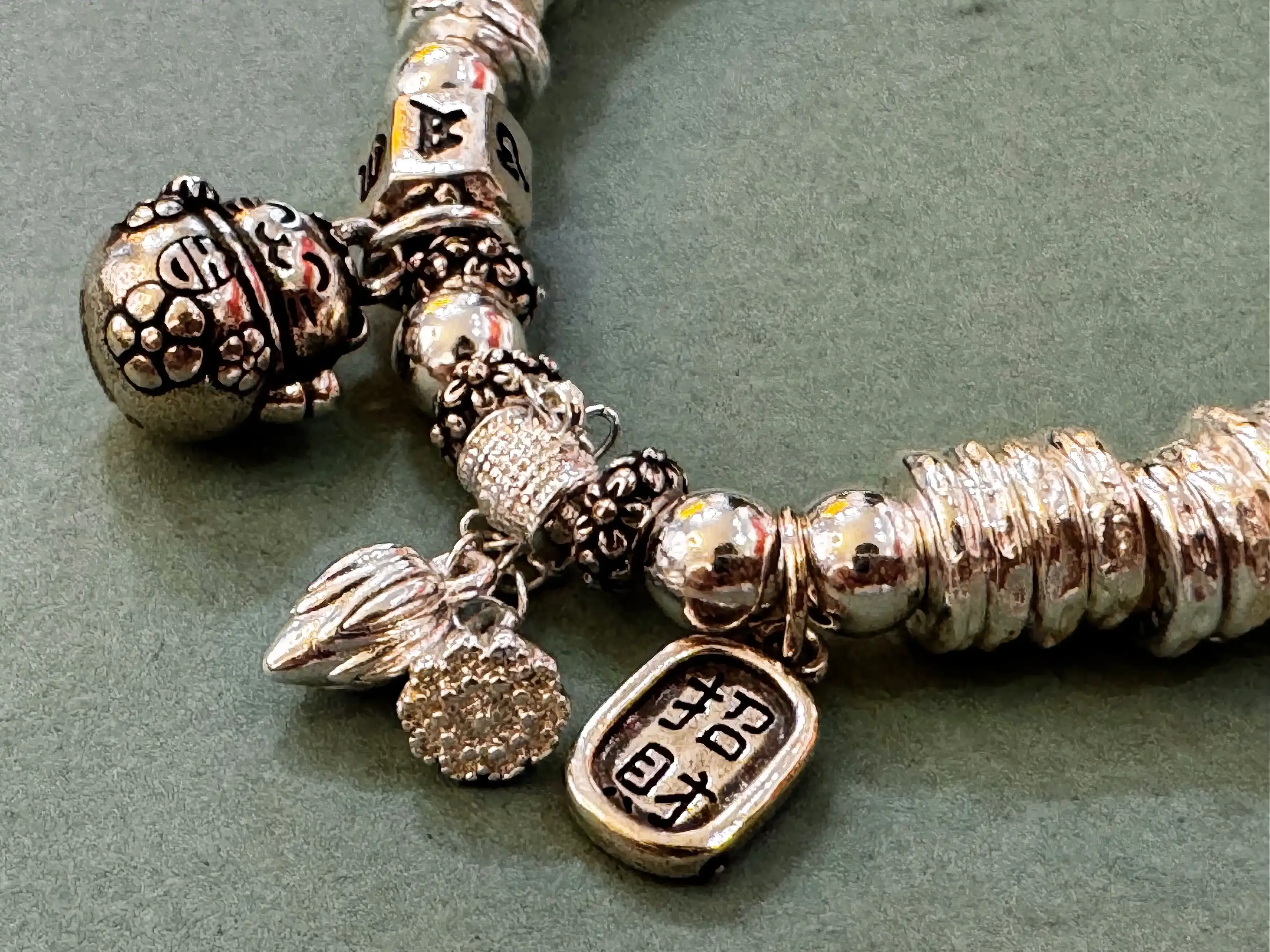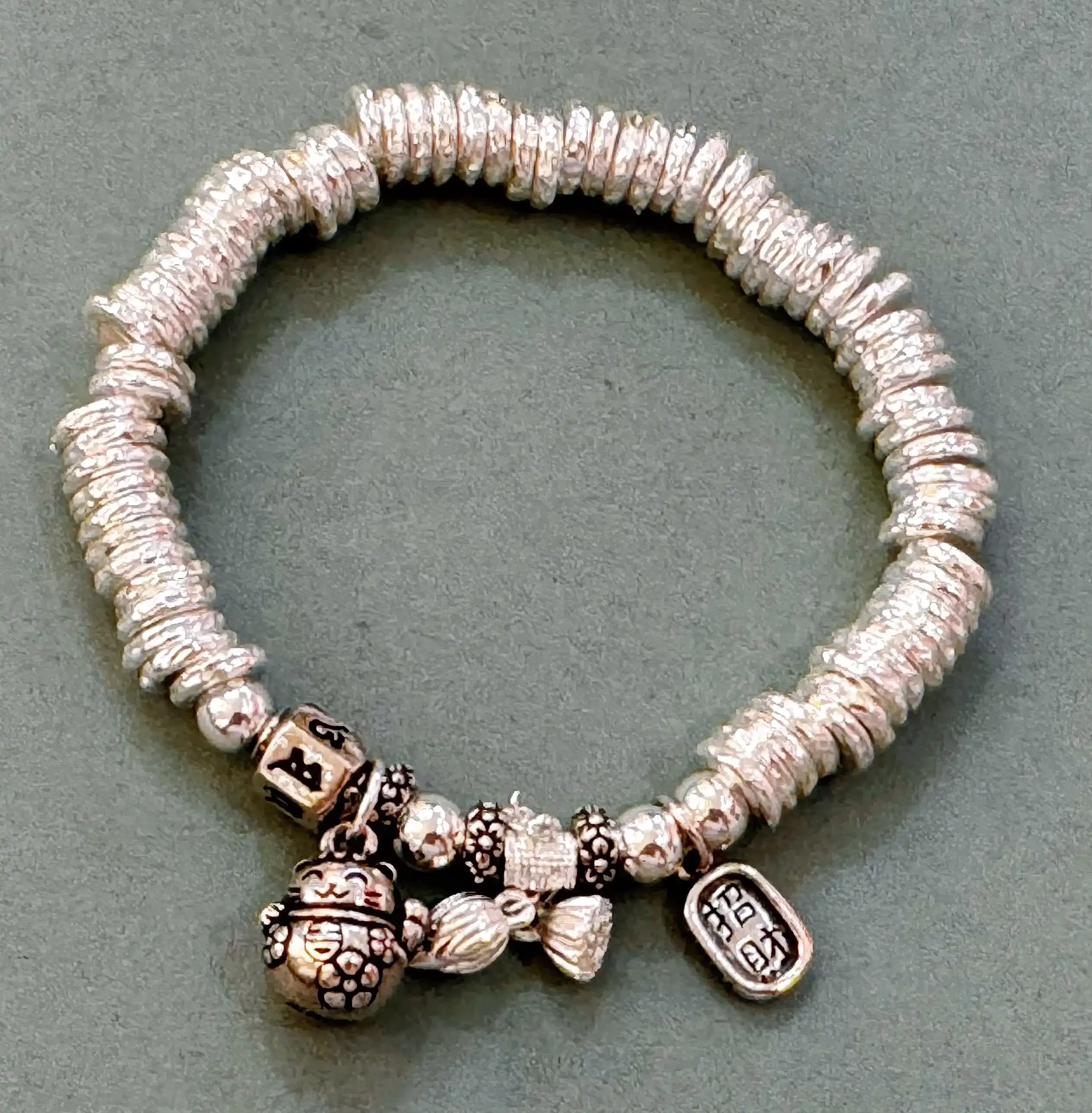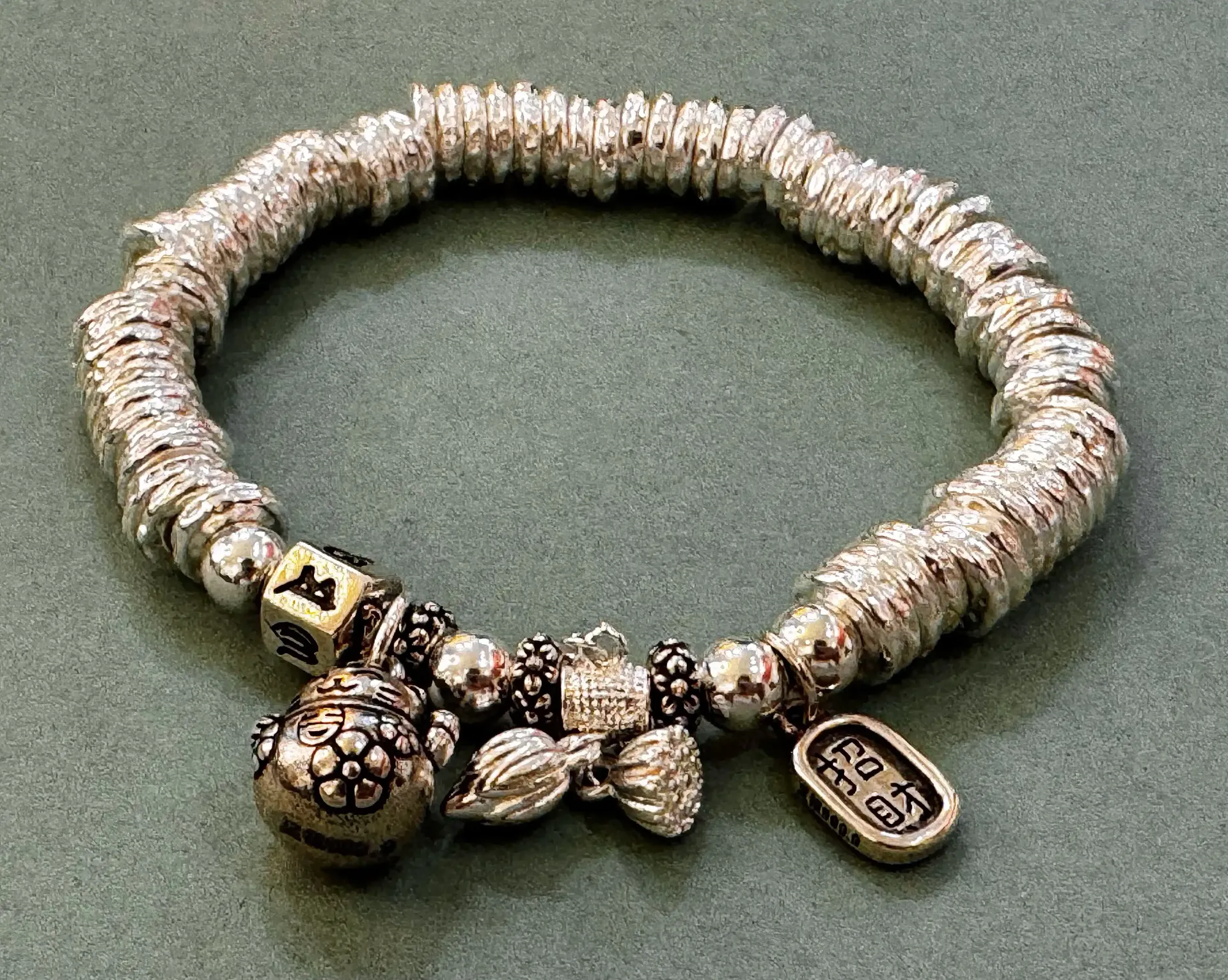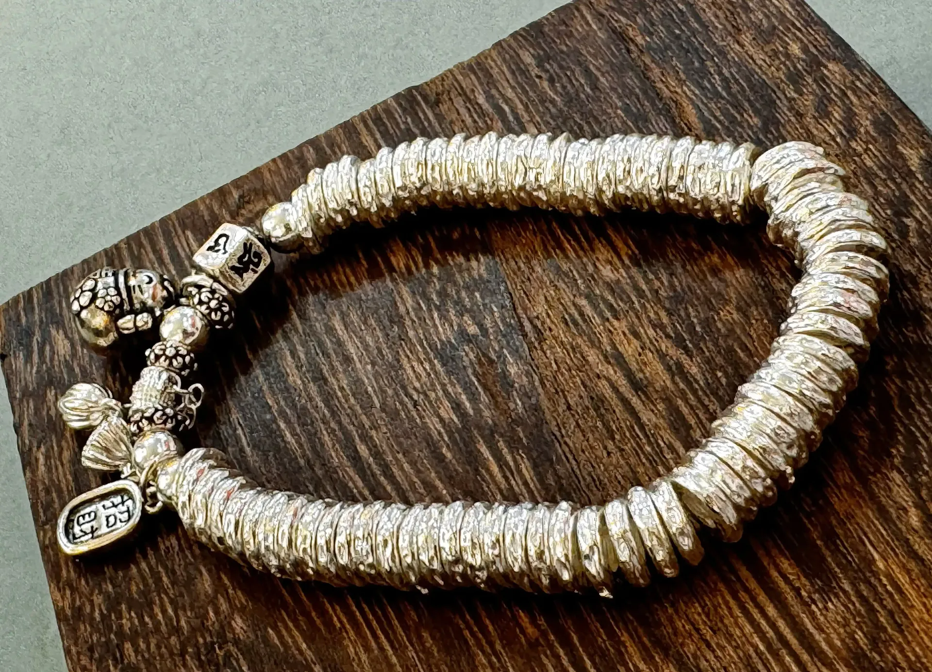 Gelang perak sterling bercampur dengan Hong (Hong) yang dalam, seperti air melambangkan Lima Unsur: emas menjana air, air menyuburkan bumi, dan bumi menjana emas, mewujudkan kitaran tenaga. Memakai simbol Jin Hong melambangkan kebijaksanaan dan berkat, membolehkan kekayaan mengalir dan berkat yang mendalam untuk dinyatakan, menandakan kekayaan, keamanan, dan keharmonian dalam rumah.