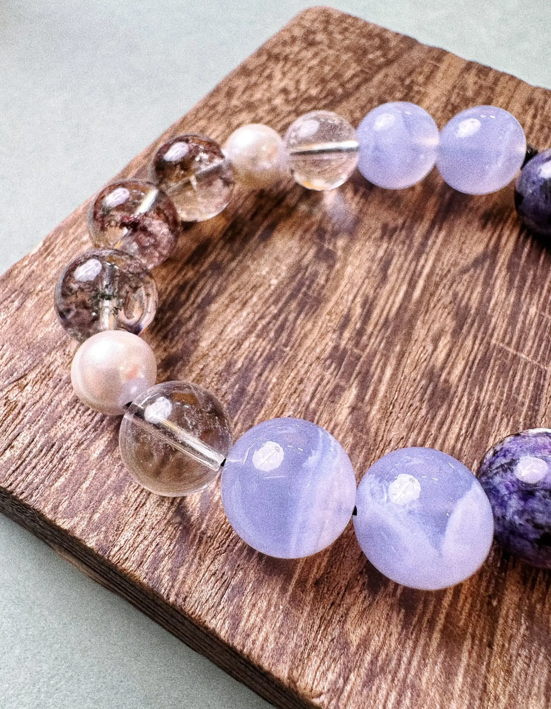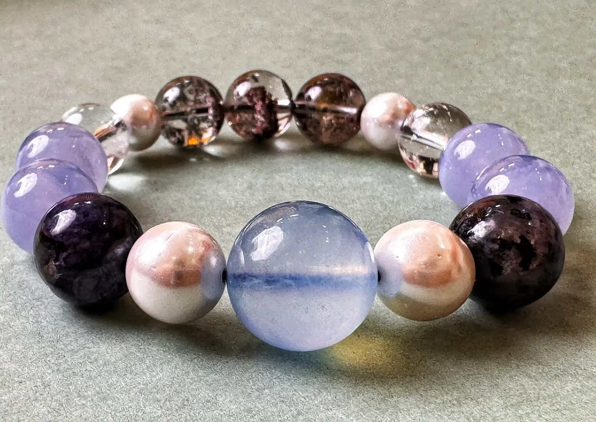 白水晶、绿幽灵、海蓝宝、珍珠与凤凰石蓝铜交织,五行能量环环相生。以水为主,润泽身心,调和气场,助健康长存,亦带来灵性平和与自然和谐。