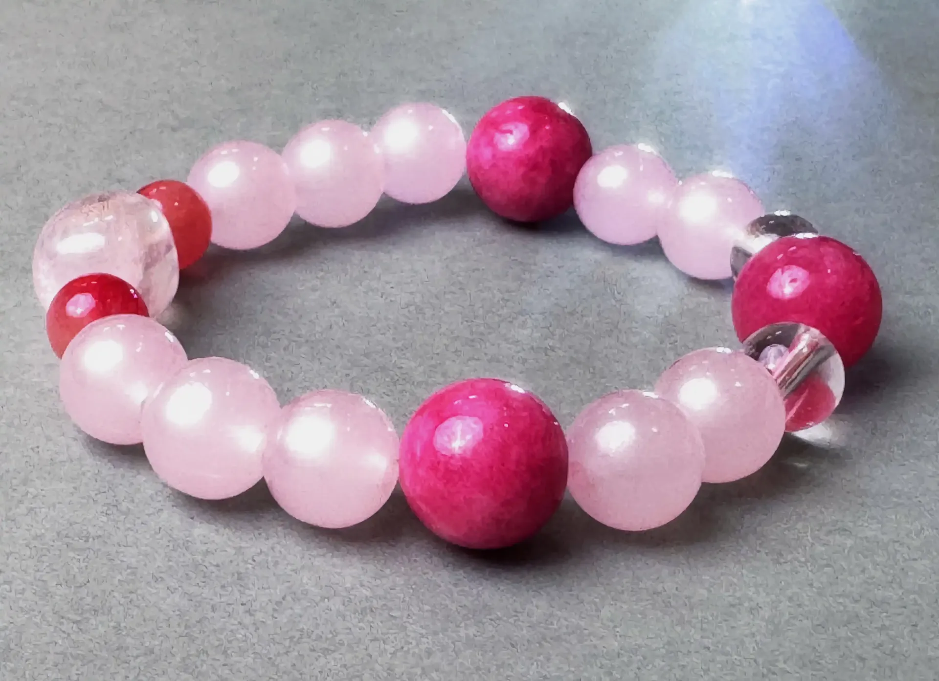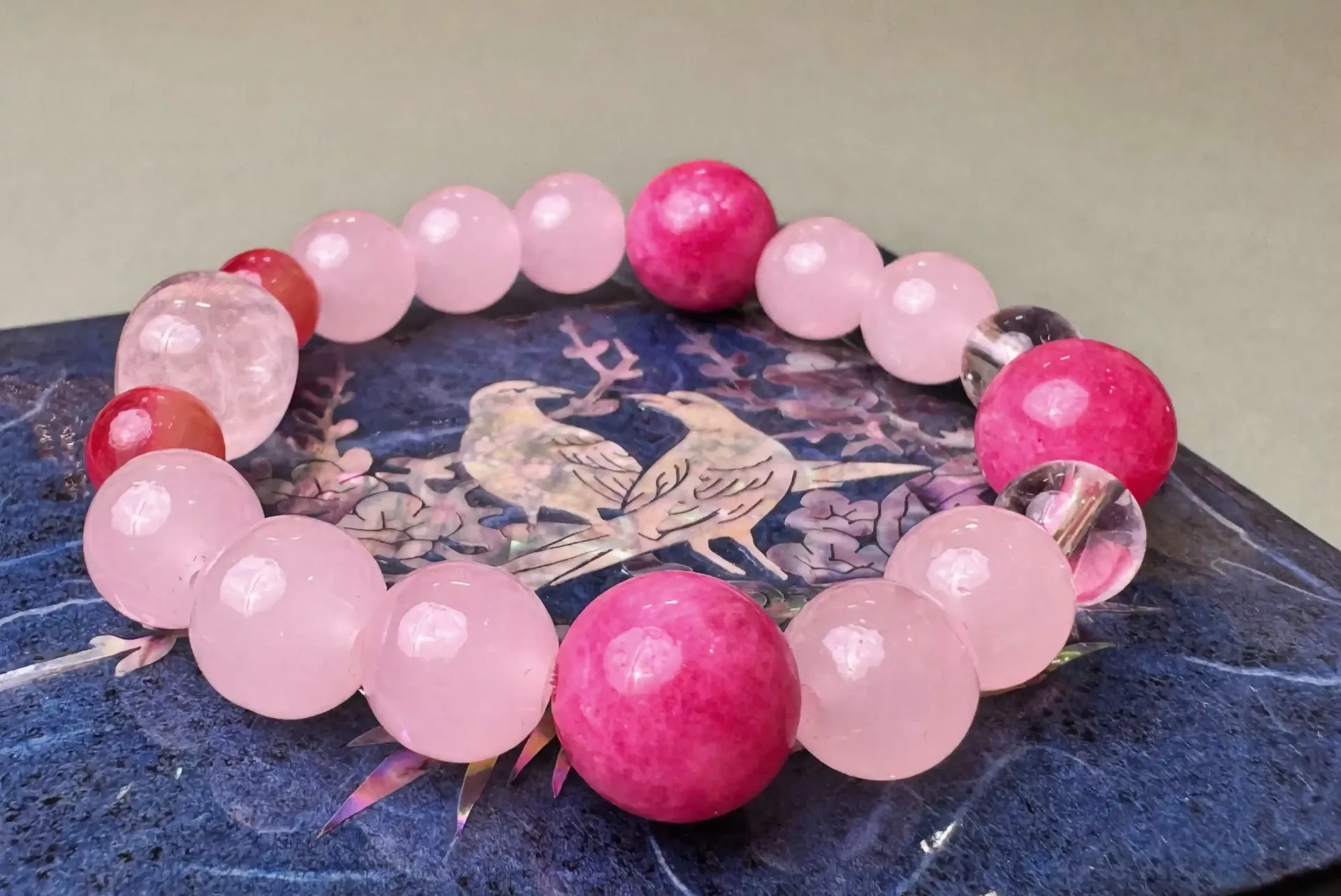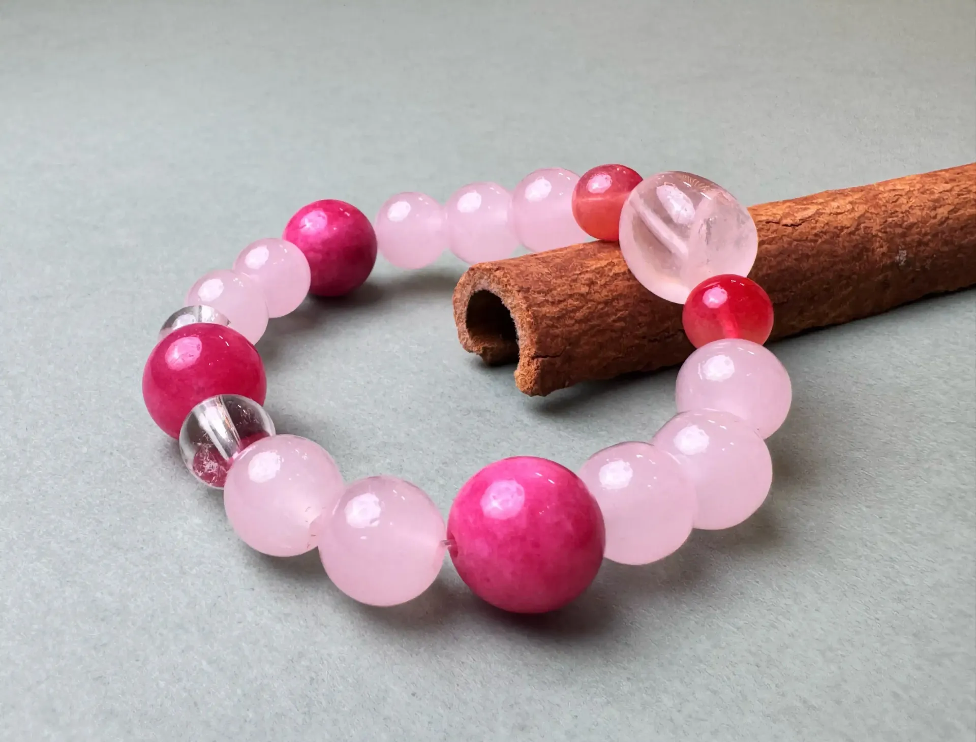 主要材质 :天然粉蔷薇玫瑰石(12.4mm) 、白色水晶(8.6mm)、粉水晶(10.4mm)、南红(8.3mm)