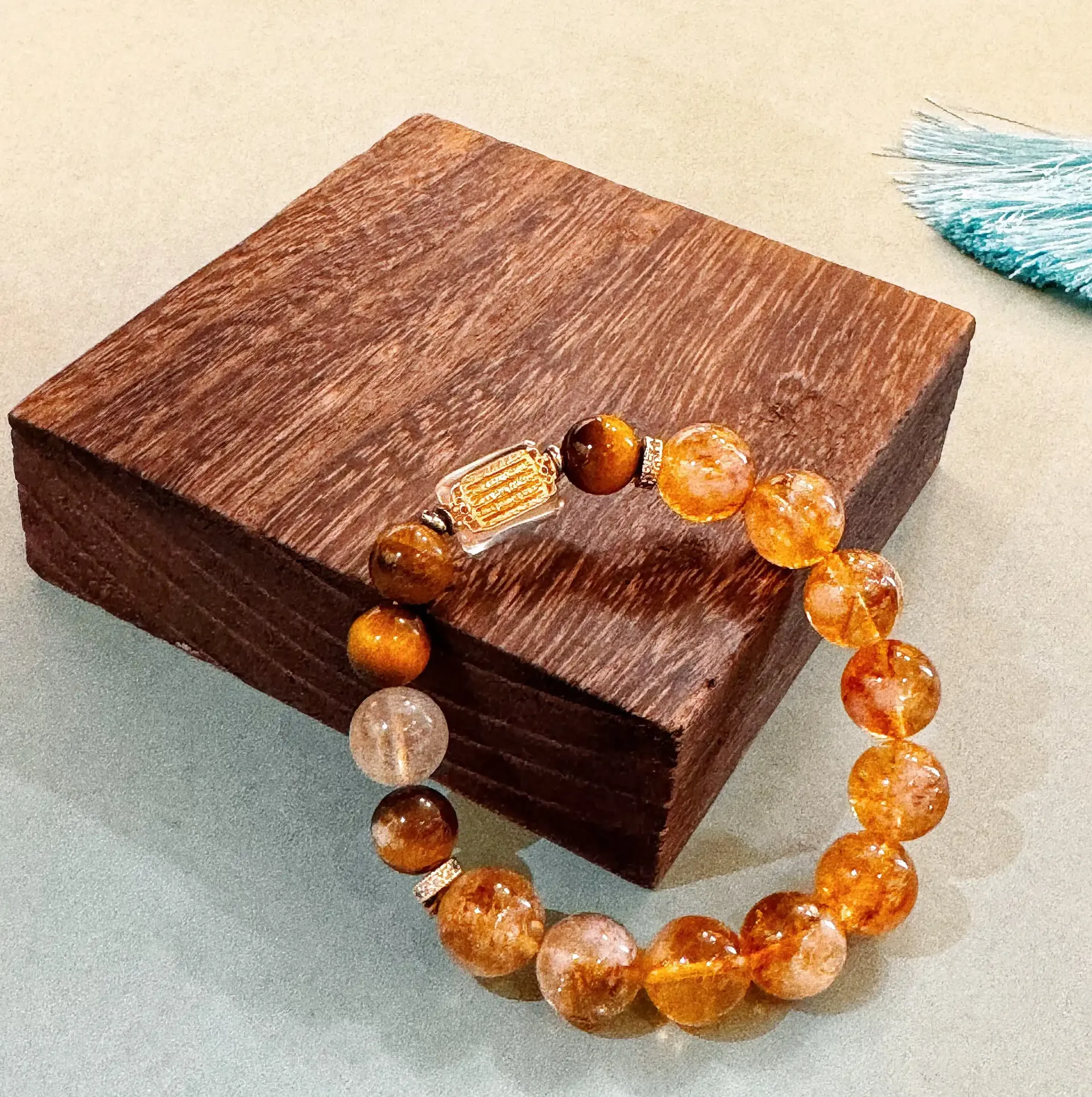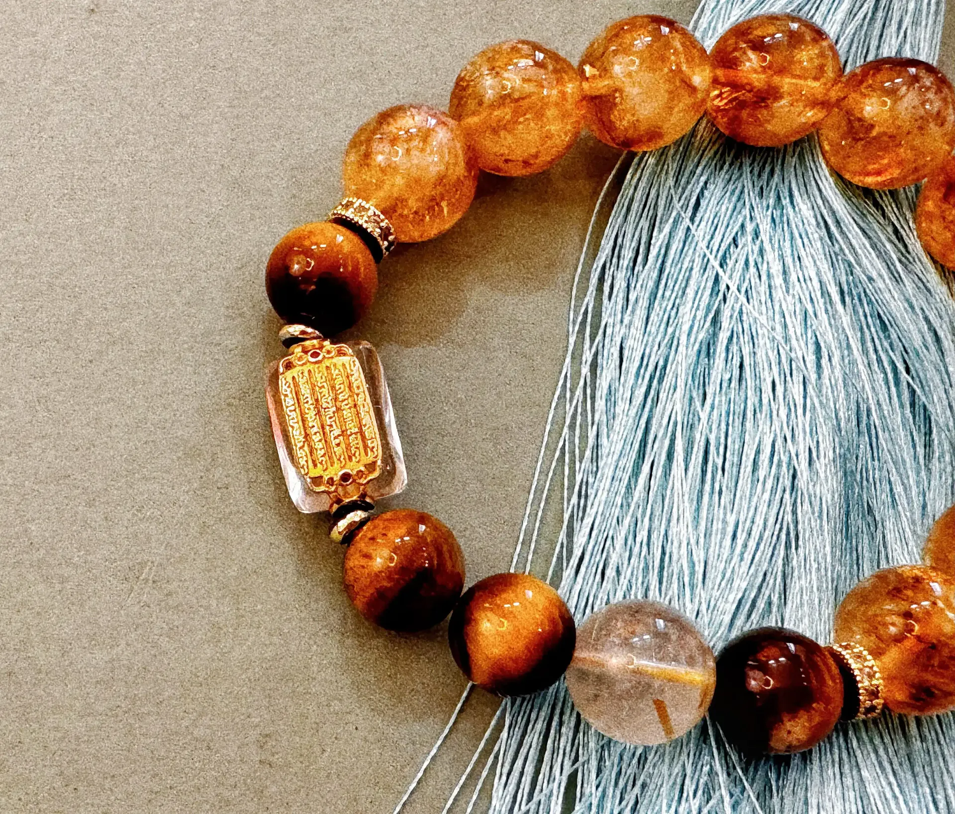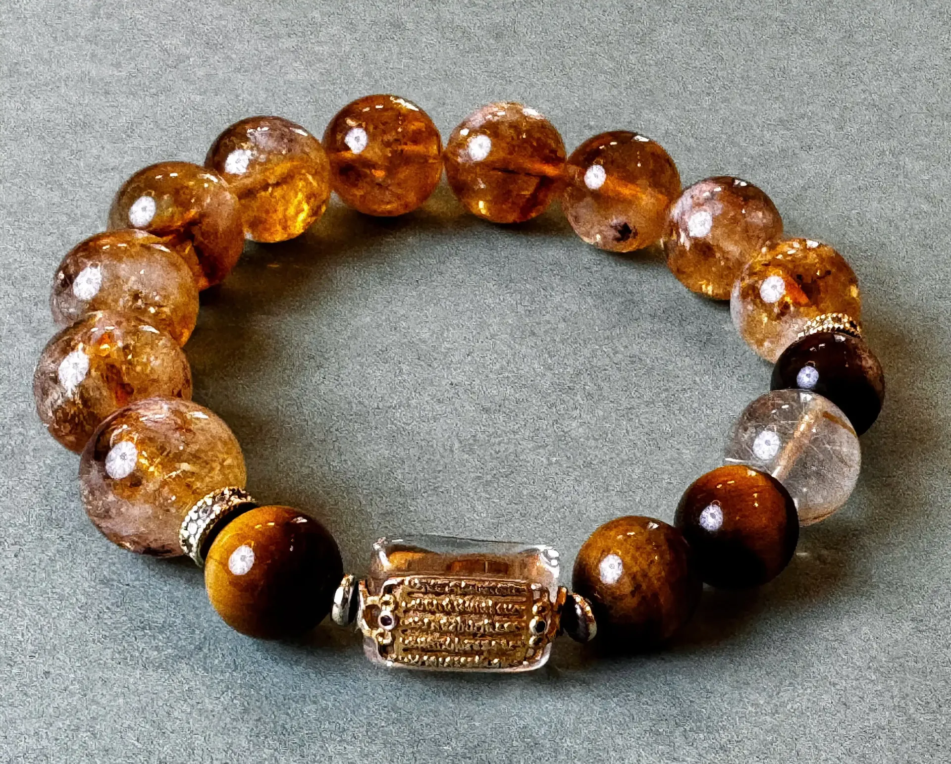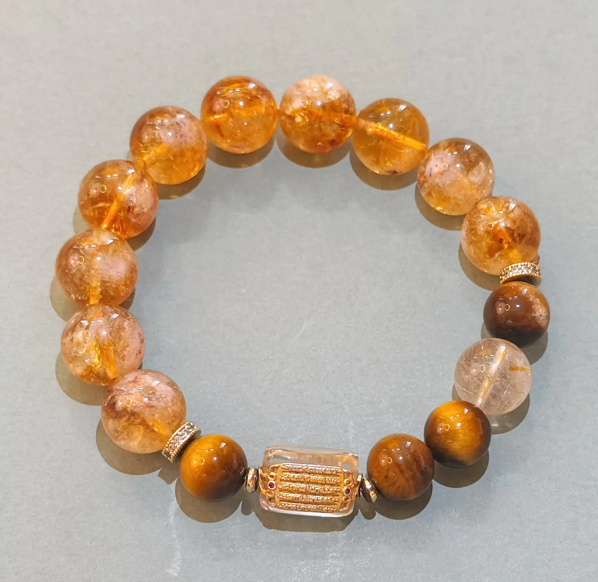 主要材质 :黄水晶(11.7mm)、五条经文 、闪电黄虎眼(10.2mm)、金发晶(12.5mm)