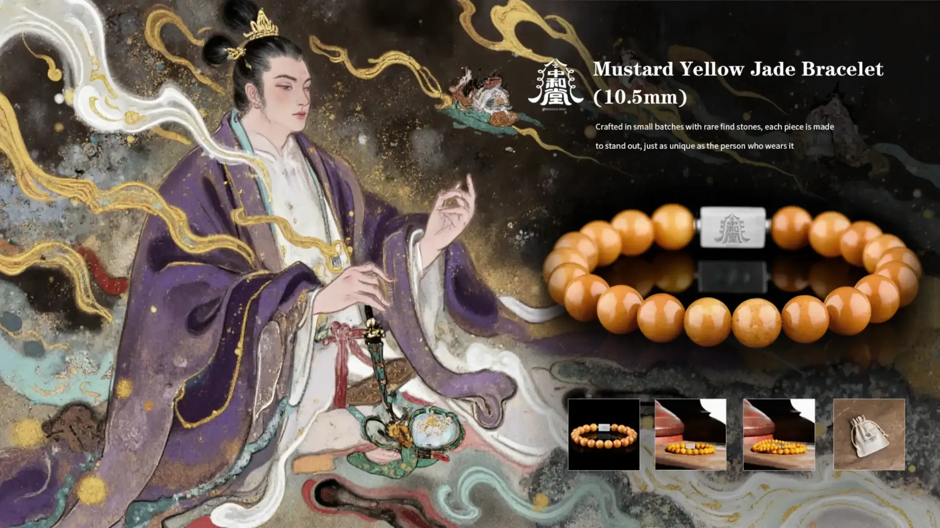 五行循环依循火生土、土生金、金生水,形成完整闭环,象征财富能量不断汇聚与流动。整体手串设计呈现金丝闪耀与光泽流动的视觉效果,如太阳光辉映照下的金河奔腾,每颗珠子都散发祥瑞能量。
